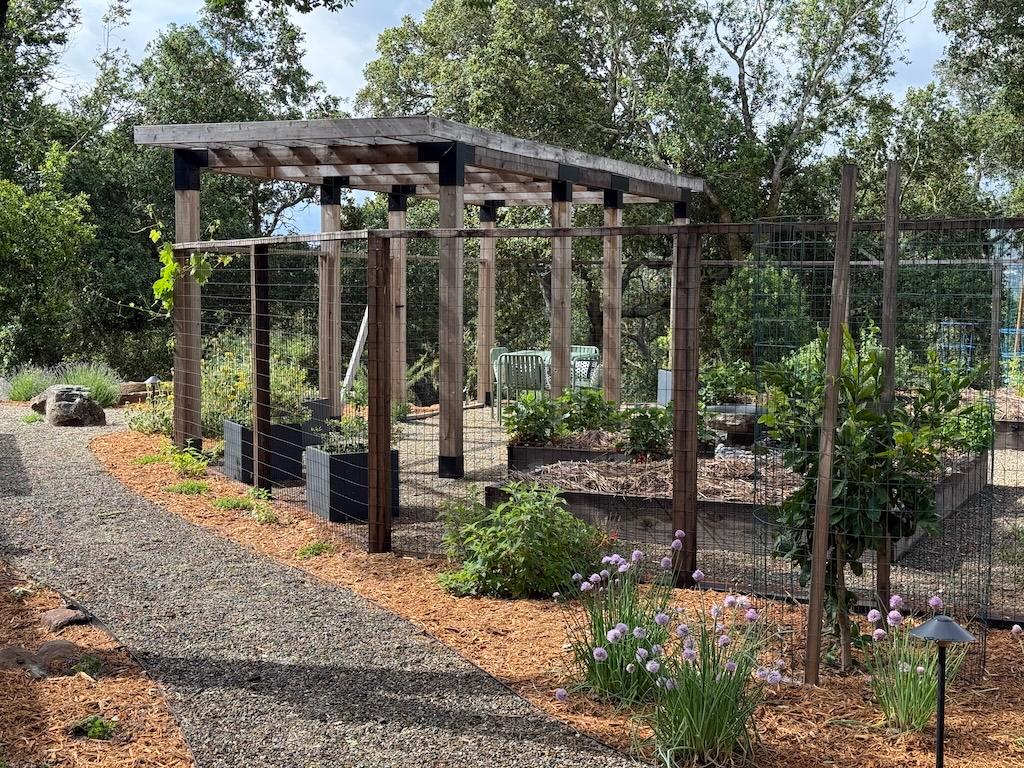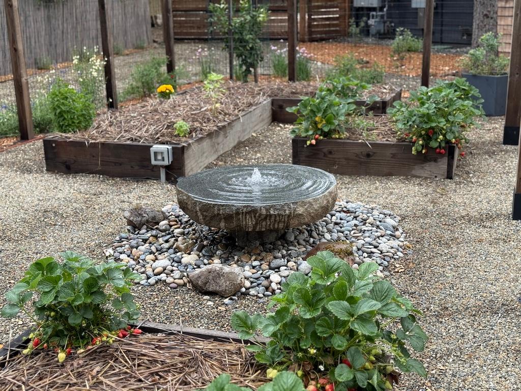 (Before and after, above): Our client desired a vegetable garden and sitting space that could be protected from the many wild-roaming deer and turkeys. Given the challenges of fencing large swaths of steep, rocky terrain, we opted to build an enclosed arbor area made with eco-friendly manufactured lumber and animal-resistant fencing. The lighter-weight beams use less wood and are easier to transport and install. Our client loves to spend time in their garden, watching the wildlife that are free to wander the rest of the grounds. The fountain, made from a re-purposed millstone, provides soothing ambience to the space. (Two more views, below:)